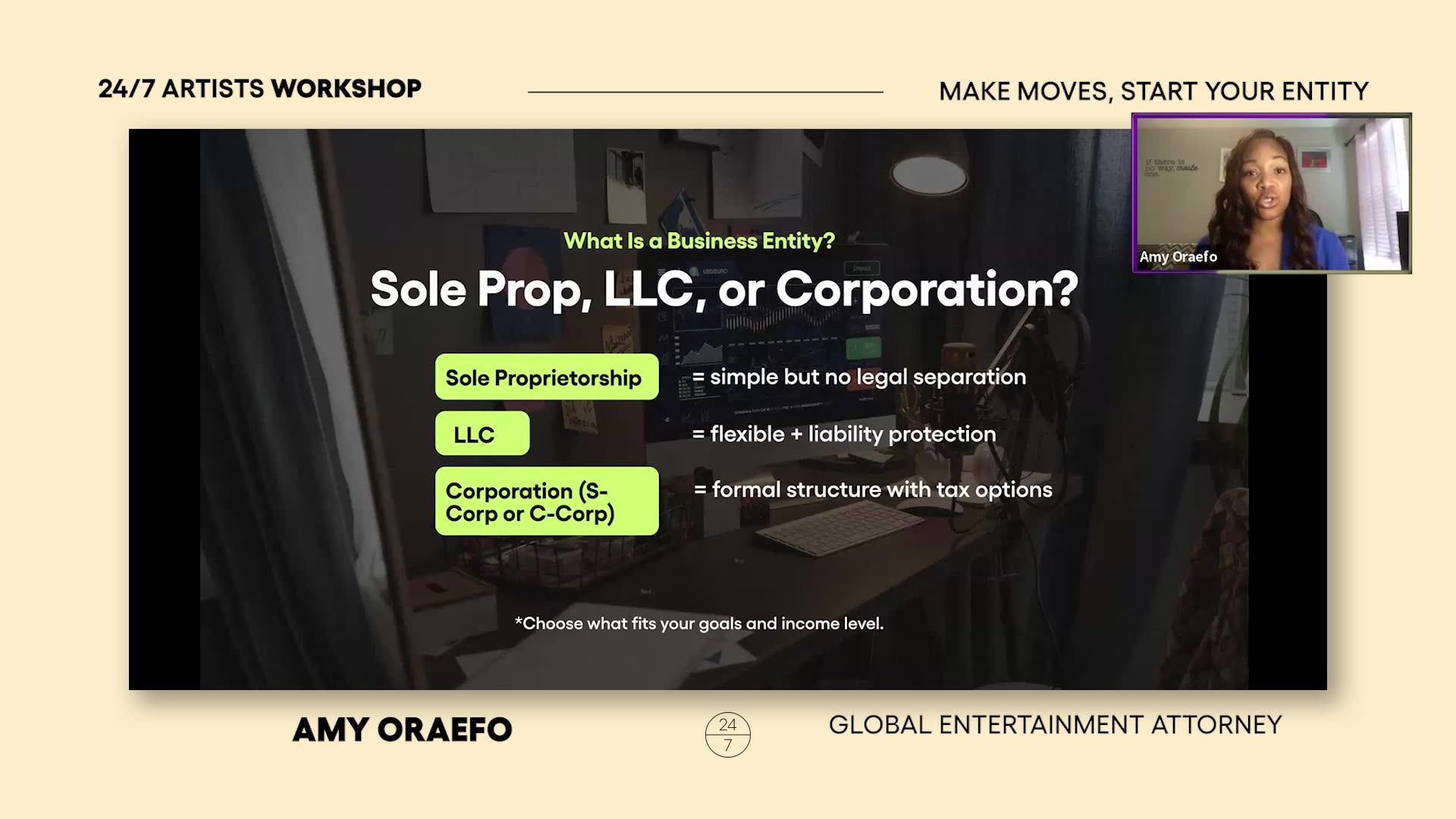 Learn from entertainment lawyer Amy Oraefo, Esq. on why and how to start your business entity as a creative. Protect your work, grow income, and scale with the right legal foundation.